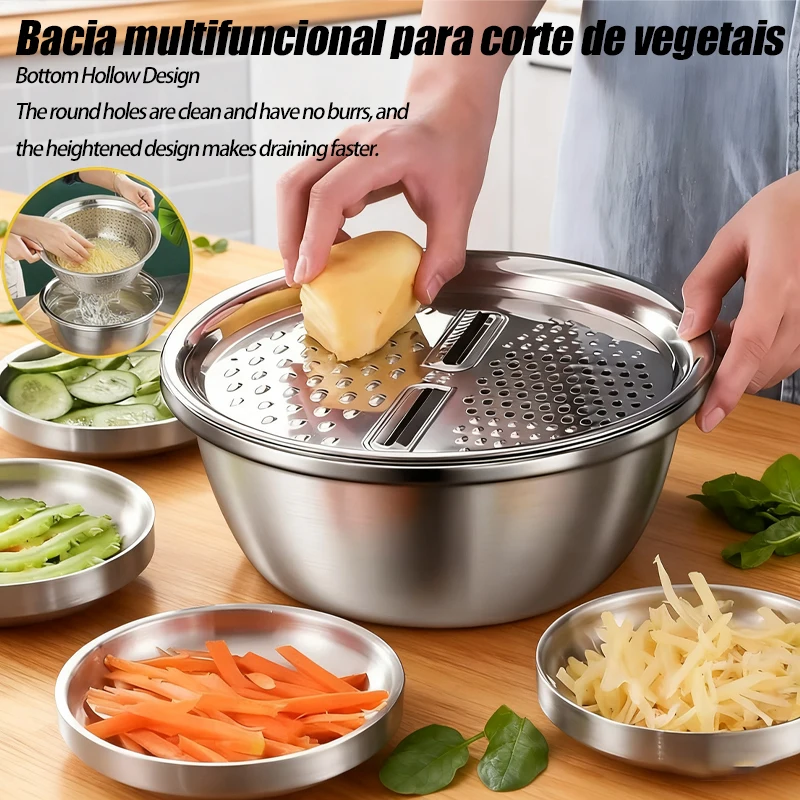 This 3-in-1 salad maker bowl is designed to simplify food preparation in the kitchen. It combines a vegetable slicer, cutter, and grater with a convenient drain basket for multi-purpose use. Made with durable materials and stainless steel blades, it ensures efficient and precise cutting. The built-in strainer allows easy washing and draining of fruits and vegetables. Ideal for preparing salads, slicing veggies, and grating ingredients quickly. The ergonomic design provides stability and ease of use during food prep. Its compact structure helps save space in your kitchen. Easy to clean and maintain after use, it supports daily cooking tasks. Suitable for both beginners and experienced cooks, it improves kitchen efficiency. This all-in-one kitchen tool is a practical addition for fast and convenient meal preparation.
