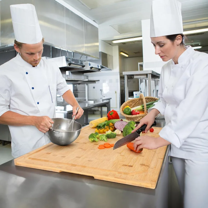 This 36 x 24 extra large bamboo cutting board provides a spacious and durable surface for food preparation. Crafted from natural bamboo, it offers strength and long-lasting performance for everyday kitchen use. The oversized design is ideal for handling large cuts of meat, vegetables, and bulk meal prep. It also functions as a convenient stove top cover, adding extra counter space when needed. Smooth edges and a sturdy built-in handle make lifting and moving easy. The thick construction enhances stability during chopping and slicing. Bamboo’s dense surface helps resist knife marks while maintaining blade friendliness. Suitable for cutting, carving, serving, or meal preparation tasks. Easy to clean and maintain for daily use. This multi-functional board is a practical addition to any modern kitchen.